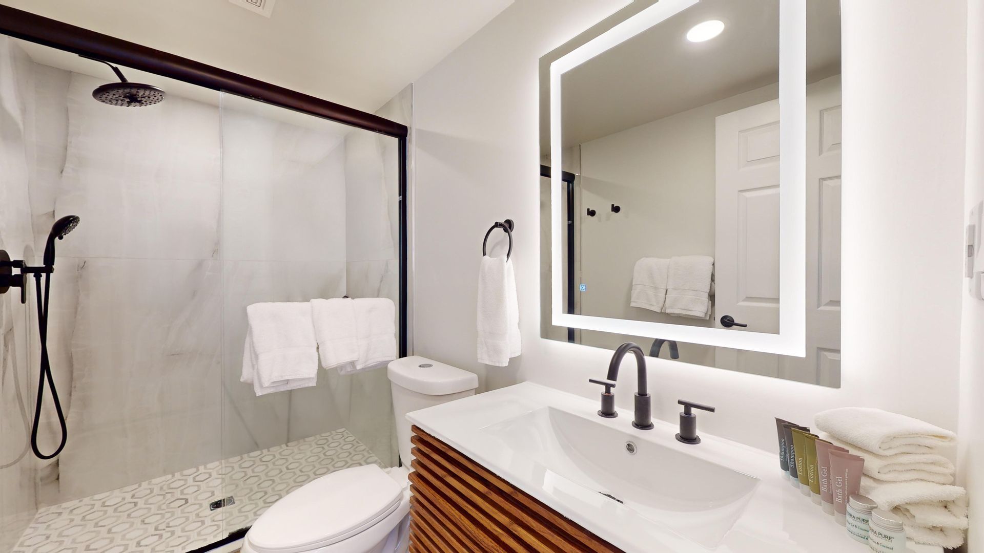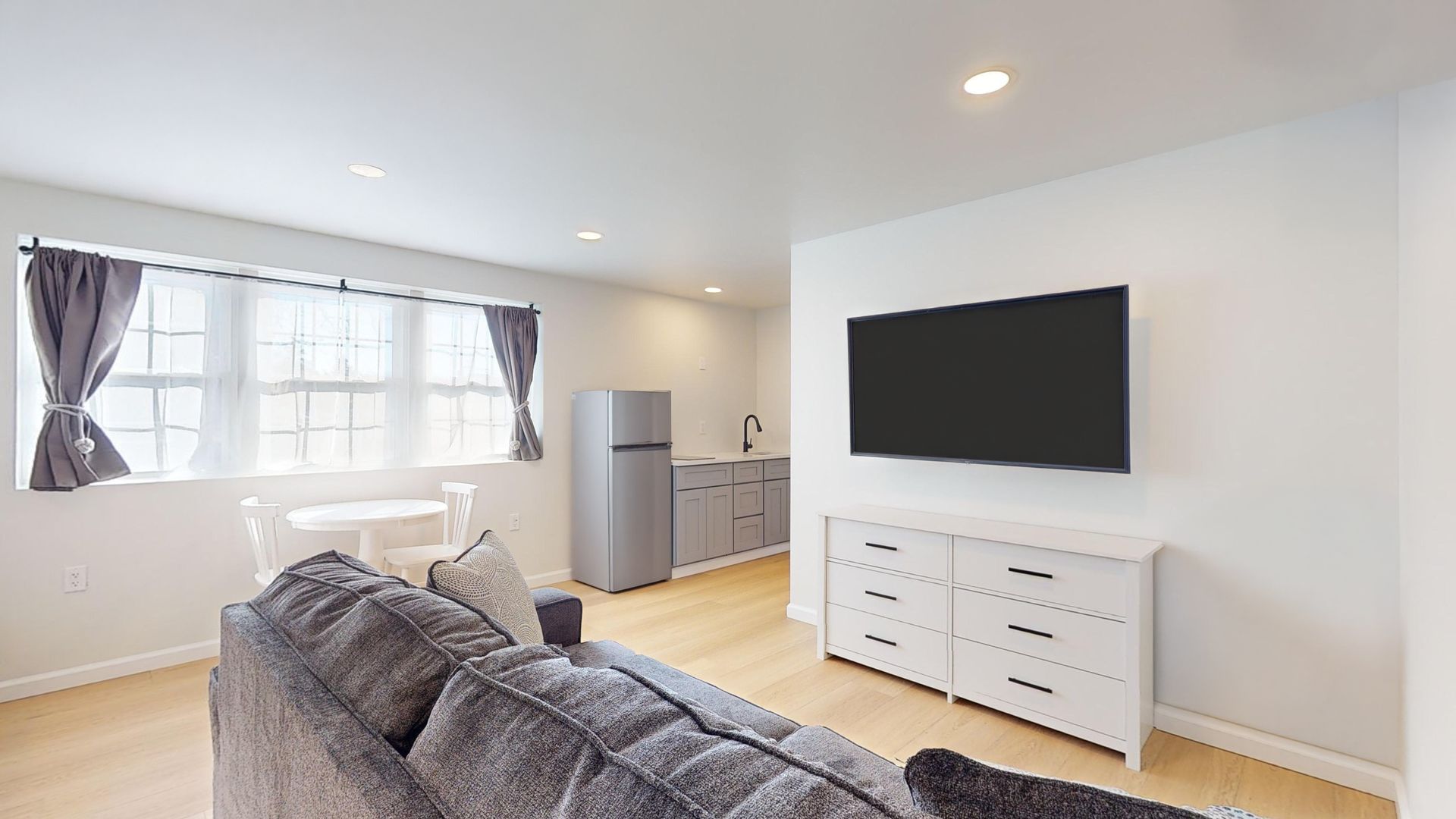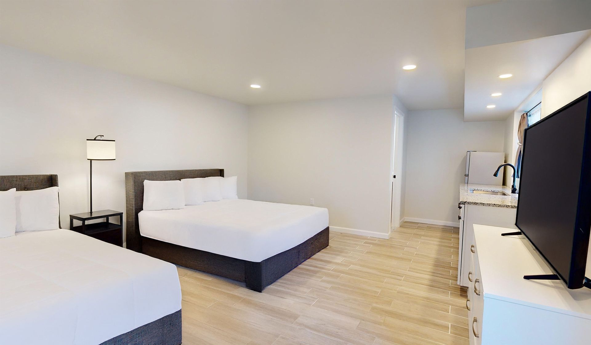 Our Double Queen Suite offers a spacious and comfortable retreat, featuring two plush queen-sized beds and a convenient pull-out sofa bed. Enjoy entertainment on the large 58" flatscreen smart TV, or prepare a meal in the well-equipped kitchenette, complete with a 2-burner electric cooktop, a compact refrigerator, and a microwave. The newly renovated bathroom boasts sleek, modern finishes for a refreshing experience.